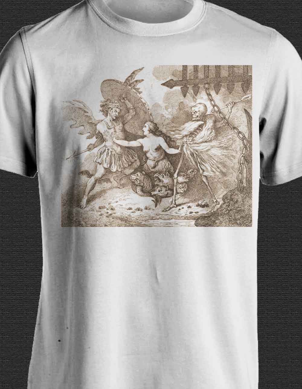 An illustration to John Milton’s epic poem, ‘Paradise Lost.’ Satan, on the left, confronts Death who bars his way from hell to earth. Between them is Sin, shown as a naked woman.